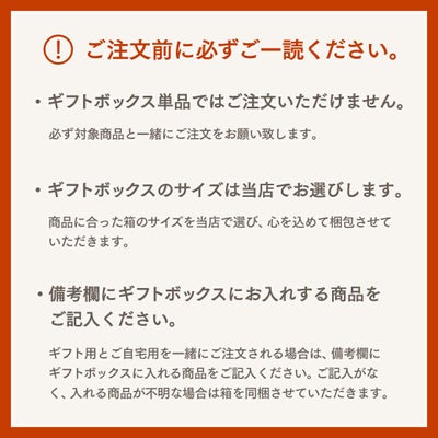 ギフトボックスに入れる商品と一緒にご注文ください。 ※ボックスの種類はお選び頂けません。※ 当店で商品にあったギフトボックスを選び、丁寧にお入れ致します。 ※ギフトボックス単品ではご注文頂けません。※ ギフト用とご自宅用は別々にご注文お願い致します。 一緒にご注文された場合は、全てギフトボックスに入れさせて頂く場合がございます。 出荷までにお時間を要する場合がございます。お早めにご注文をお願い致します。 |