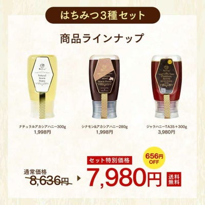 | セット内容 | ジャラハニーTA35+ 300g シナモン&アカシアハニー 280g ナチュラルアカシアハニー 300g |