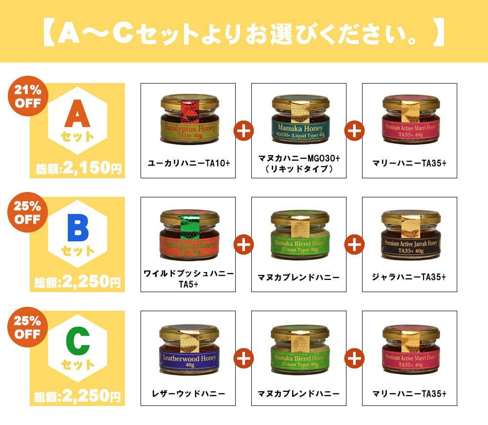 他の画像を見る オーストラリア産はちみつ7種類たっぷり楽しめるセット オーストラリア産 はちみつ 7種セット(400g×1個 500g×6個) NaTruly(ナトゥリー) 本店特価 ¥ 25,000 税込 在庫切れ 詳細を見る お気に入りに登録する
