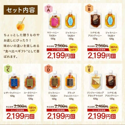 | セット内容 | 【Aセット】 マリーハニー TA35+ 120g ジャラハニーTA25+ 120g 【Bセット】 シナモン&アカシアハニー 120g ジャラハニーTA25+ 120g 【Cセット】 レザーウッドハニー 120g ユーカリハニー TA10+ 120g 【Dセット】 ジャラハニーTA35+ 120g ブラックフォレストハニー 120g 【Eセット】 ジンジャーシロップアカシアハニーマイルド 100g シナモン&アカシアハニー 120g |