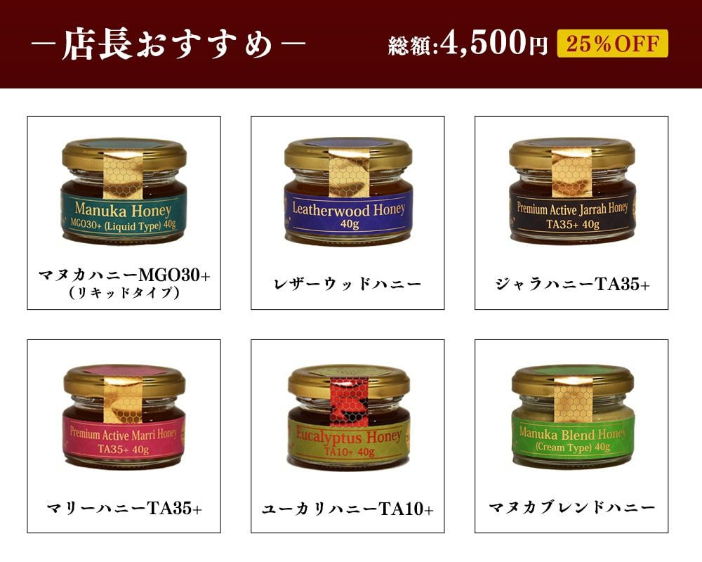 他の画像を見る オーストラリア産はちみつ3個セット(各40g) NaTruly(ナトゥリー) 【3セット以上で送料無料(沖縄除く)】 お得なセット 本店特価 ¥ 1,680 税込 在庫切れ カートに入れる お気に入りに登録する