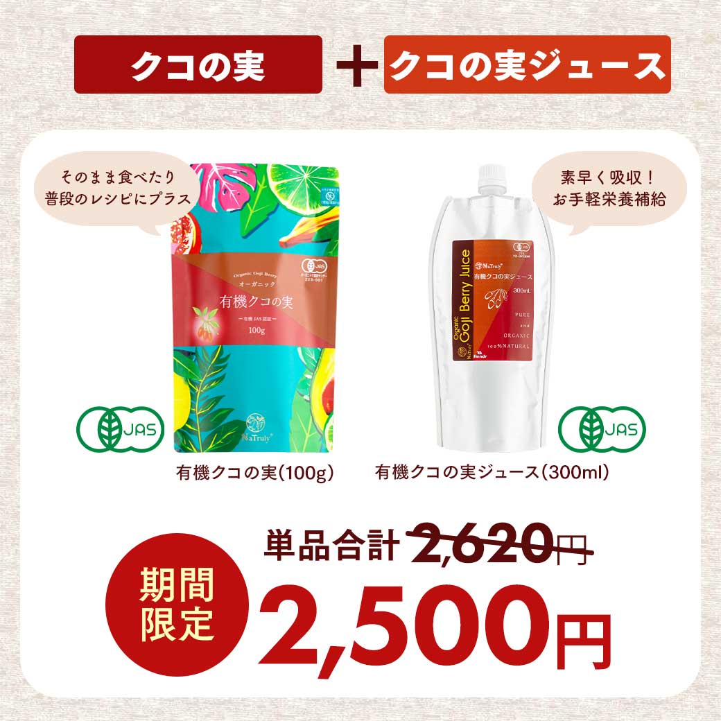 他の画像を見る 【送料無料】 クコの実ジュース 300mL&クコの実 500gセット オーガニック 有機JAS認証 クコ ゴジベリー 枸杞 クコジュース クコ果汁 お得なセット 本店特価 ¥ 3,980 税込 カートに入れる お気に入りに登録する