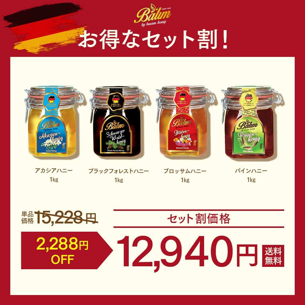 他の画像を見る 【セット特別価格】ドイツ産はちみつをたっぷり楽しみたい方に! バリム ドイツ産はちみつ 1kg×4種セット Balim(バリム) お得なセット 本店特価 ¥ 12,940 税込 カートに入れる お気に入りに登録する