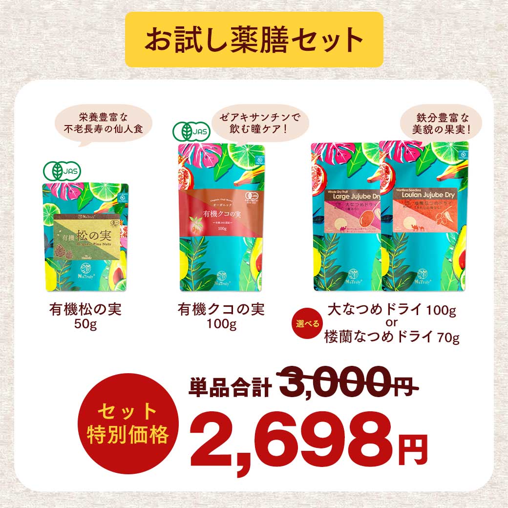 他の画像を見る 【メール便送料無料】人気の3商品!お得な薬膳セット クコの実100gと松の実50gとなつめ(種無しor種あり)の3種類が楽しめるセット NaTruly(ナトゥリー) お得なセット 本店特価 ¥ 2,698 税込 詳細を見る お気に入りに登録する
