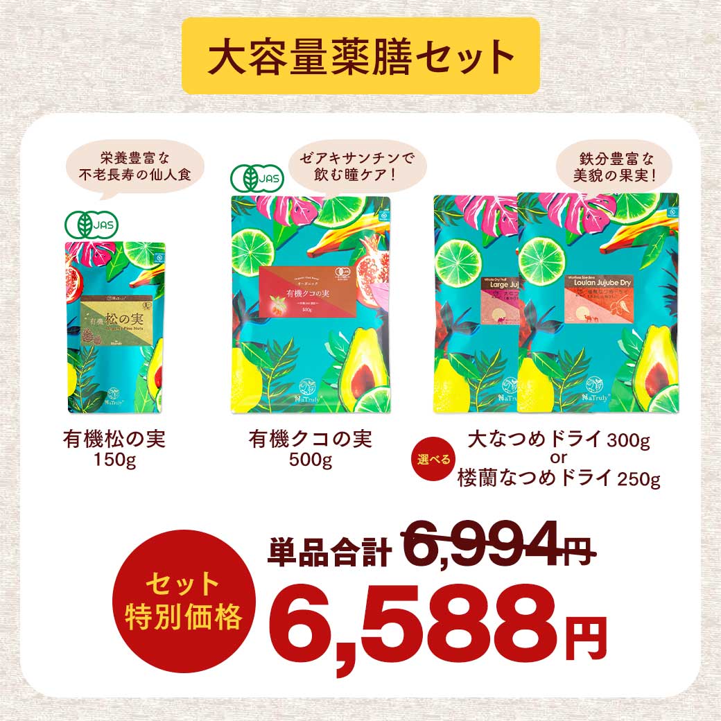 他の画像を見る 【送料無料】人気の3商品!お得な薬膳セット 大サイズ クコの実500gと松の実150gとなつめ(種無しor種あり)の3種類が楽しめるセット NaTruly(ナトゥリー) お得なセット 本店特価 ¥ 6,588 税込 カートに入れる お気に入りに登録する